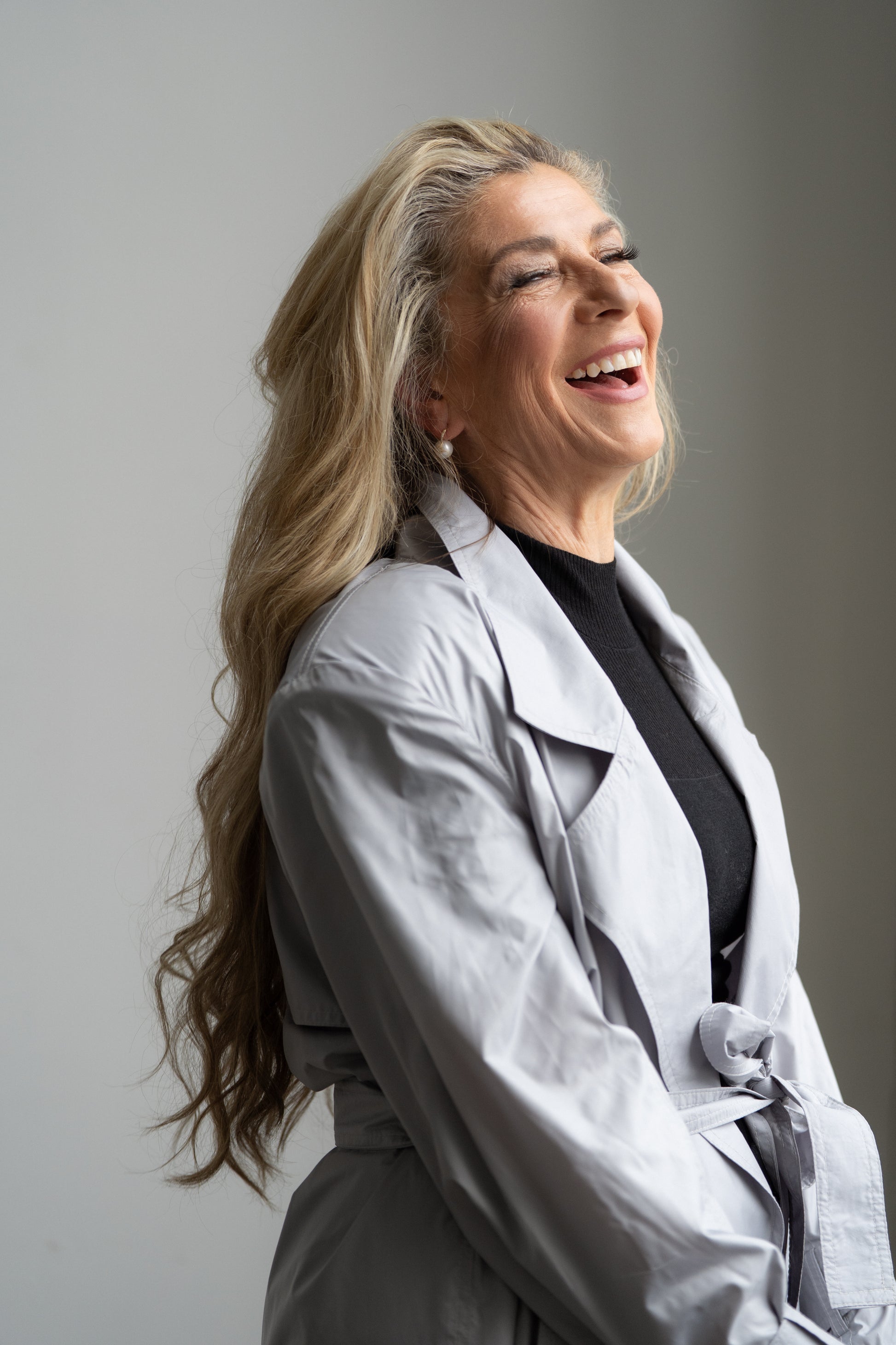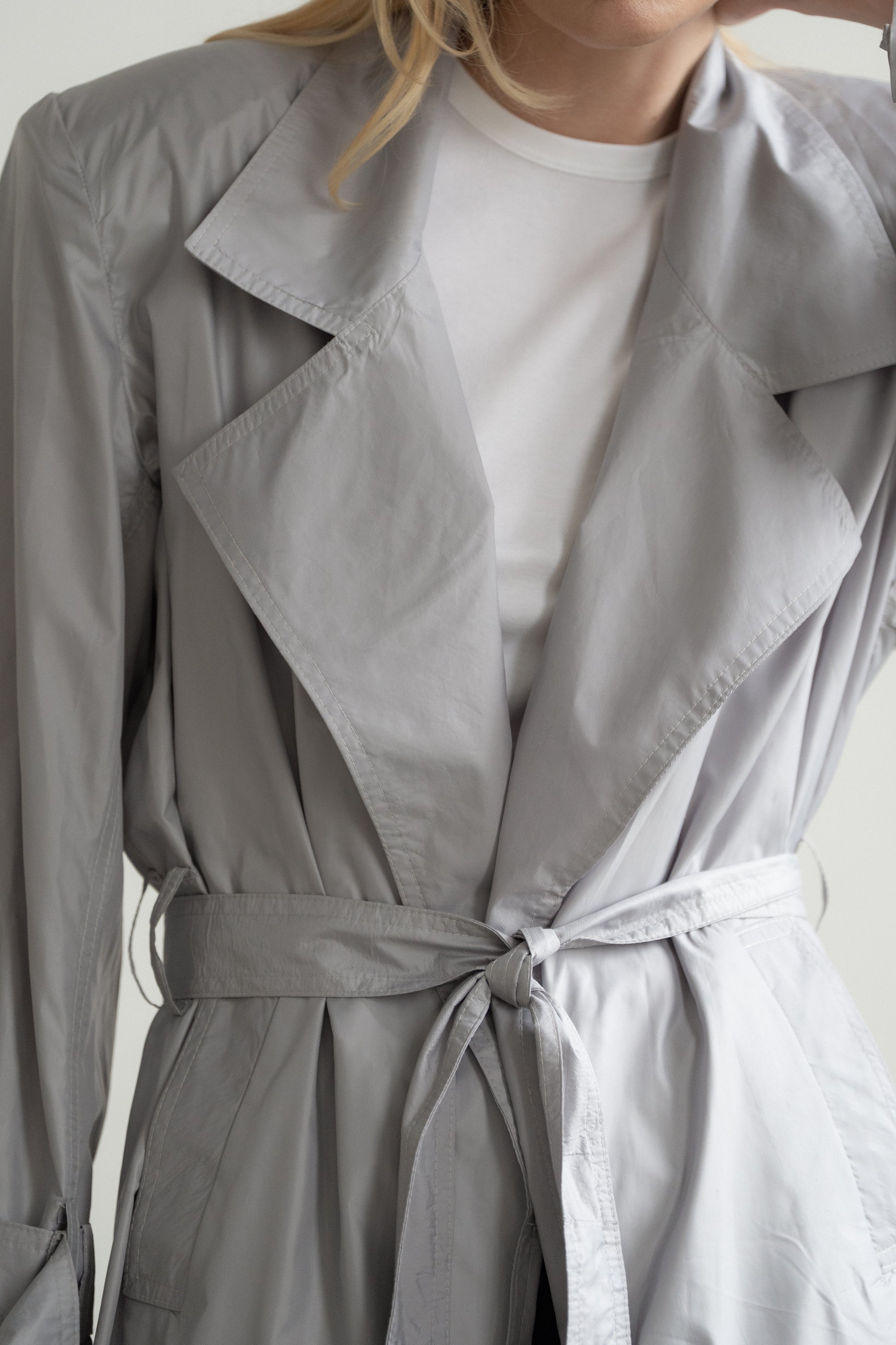 · Loop and exaggerated self-tie belt at cuffs